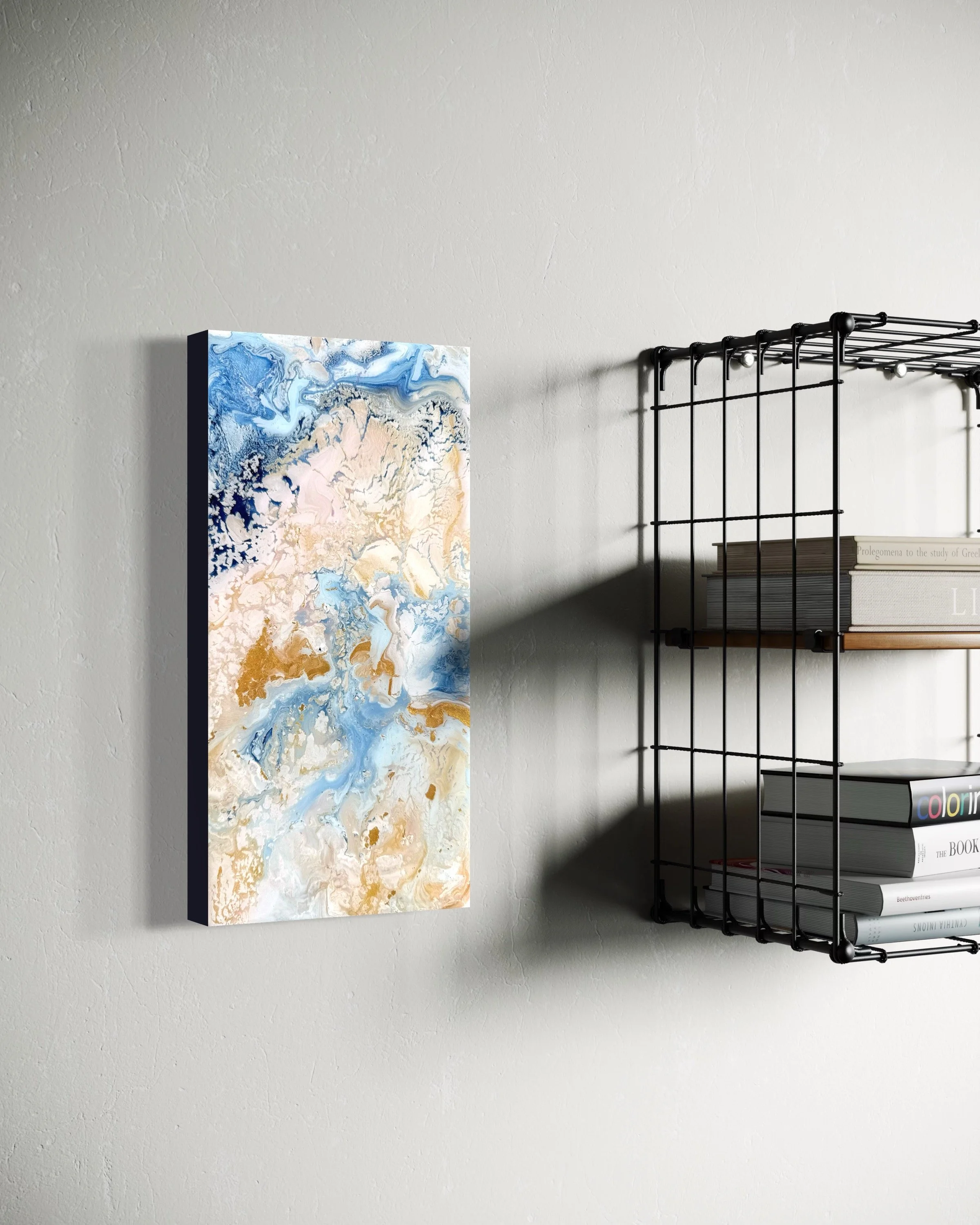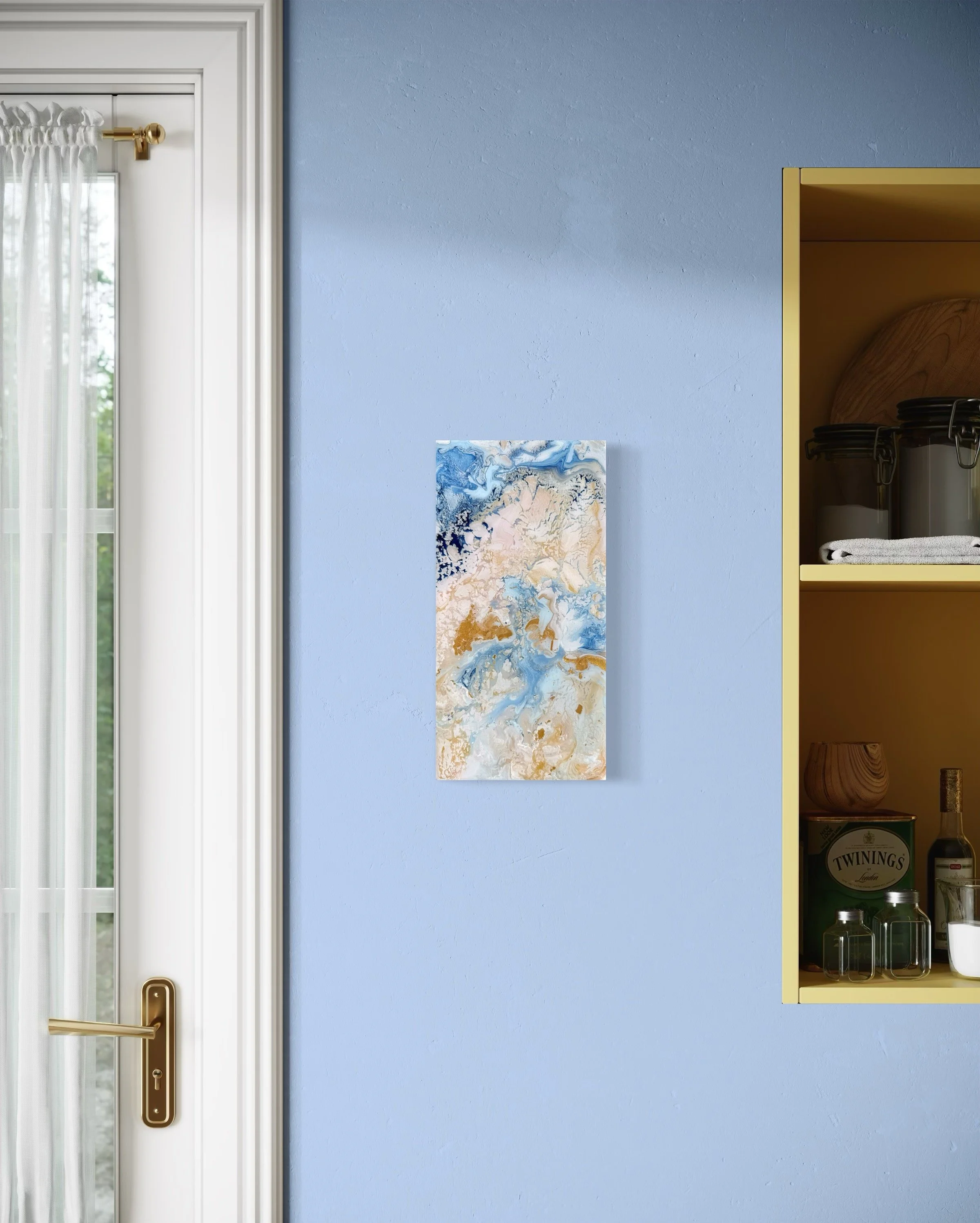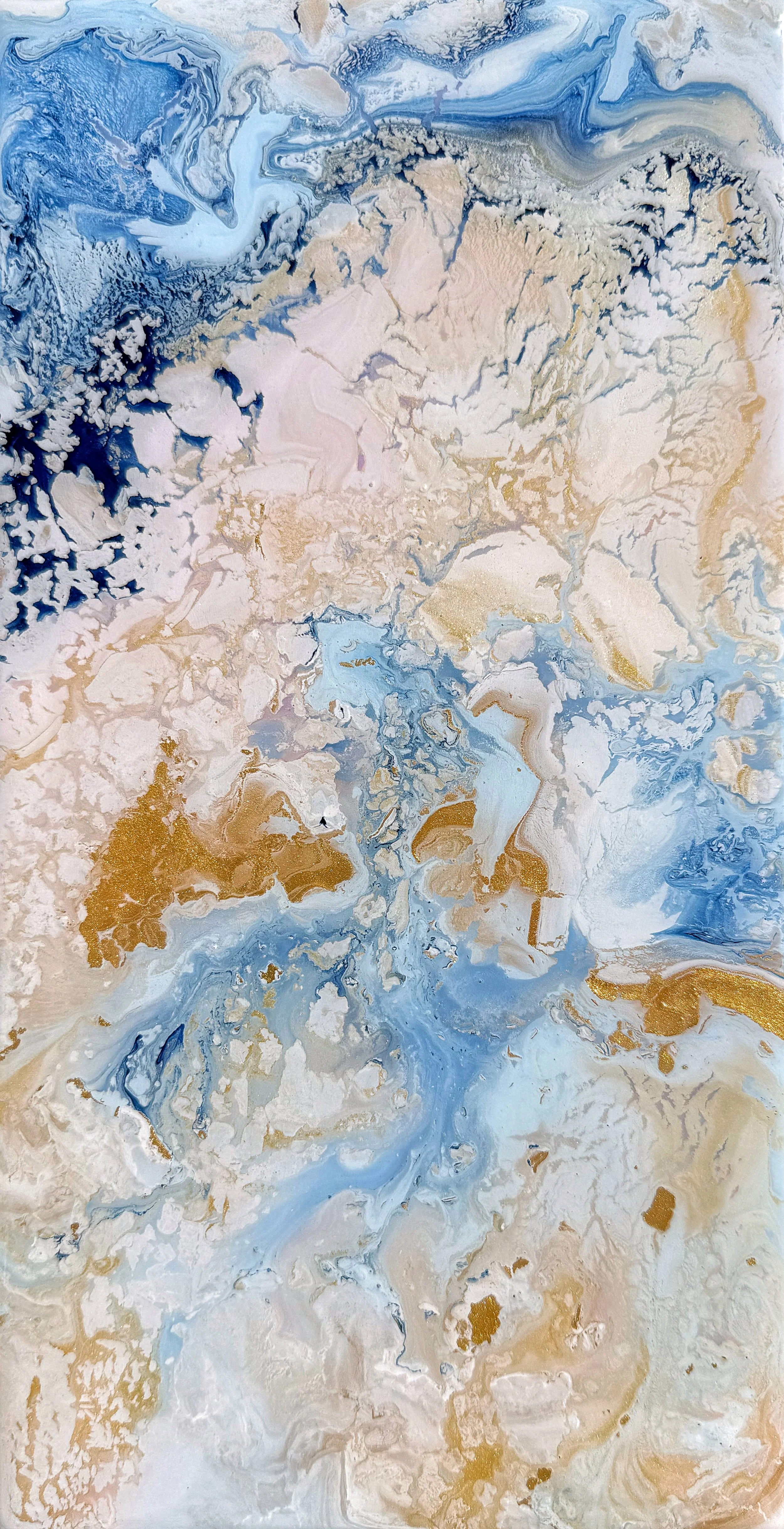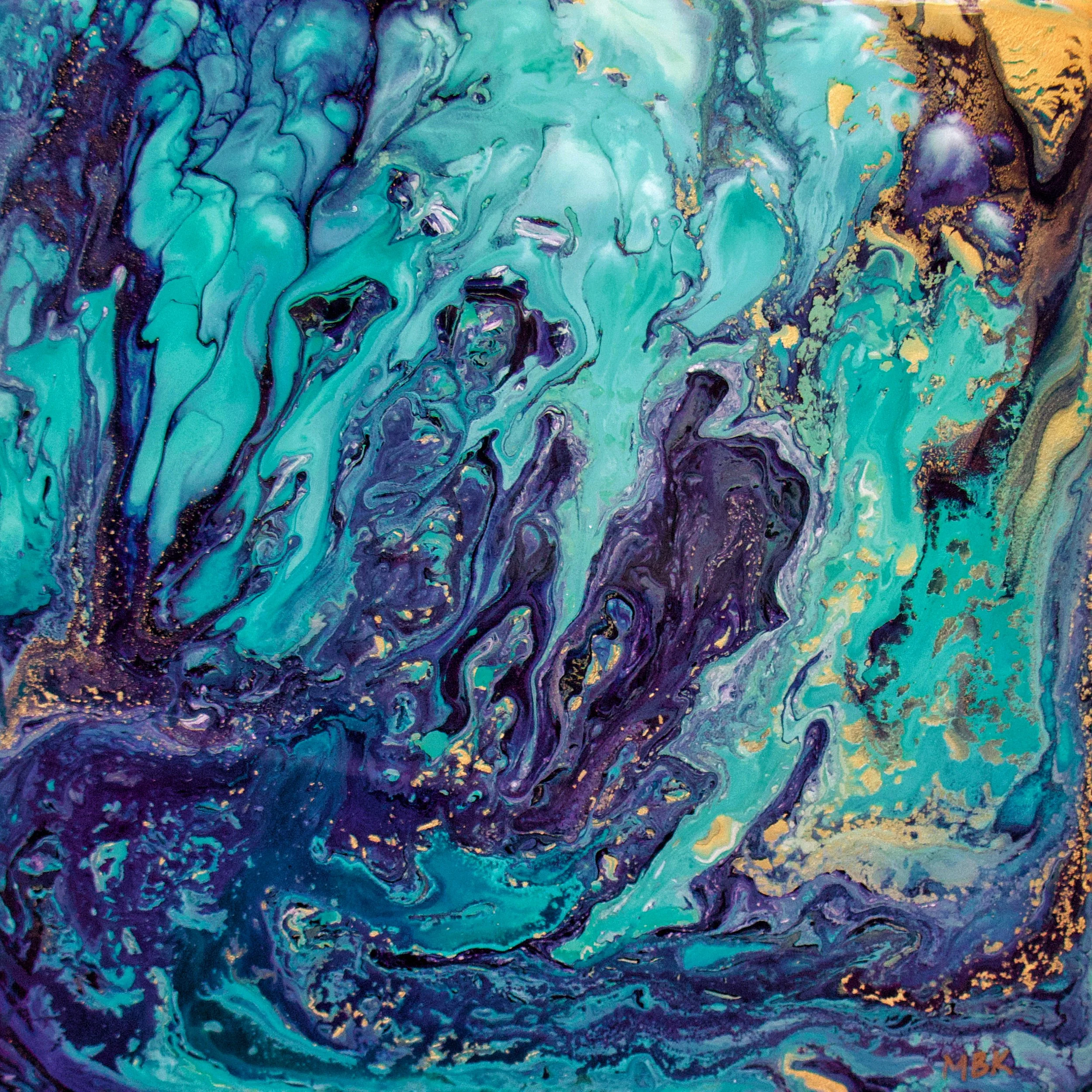 fluid acrylics and cut canvas topped with high gloss epoxy resin on 7/8” cradled wood panel