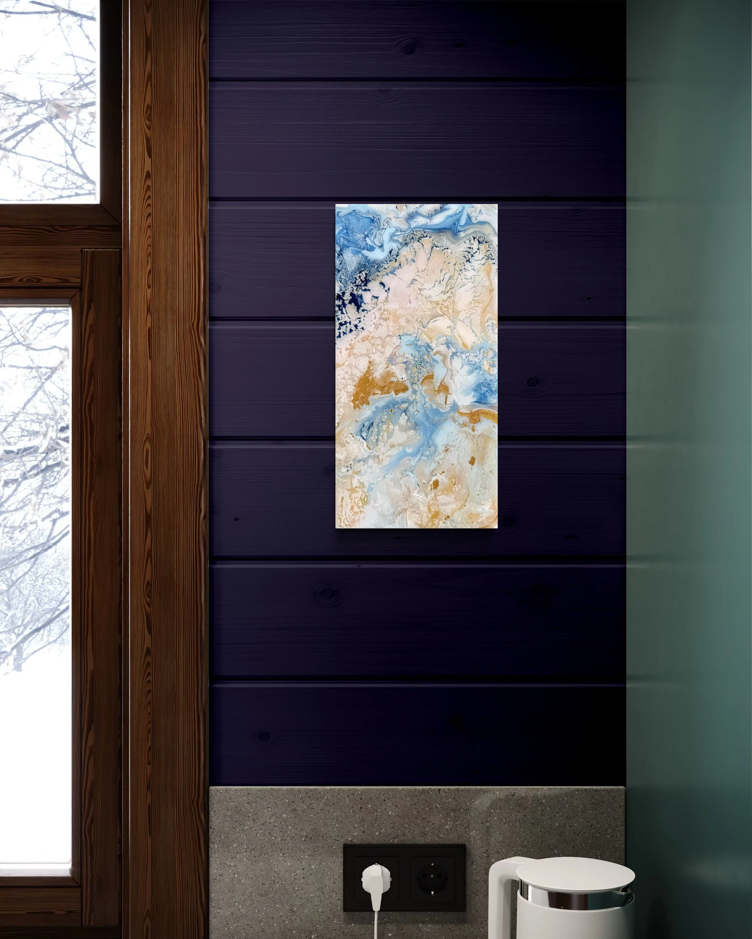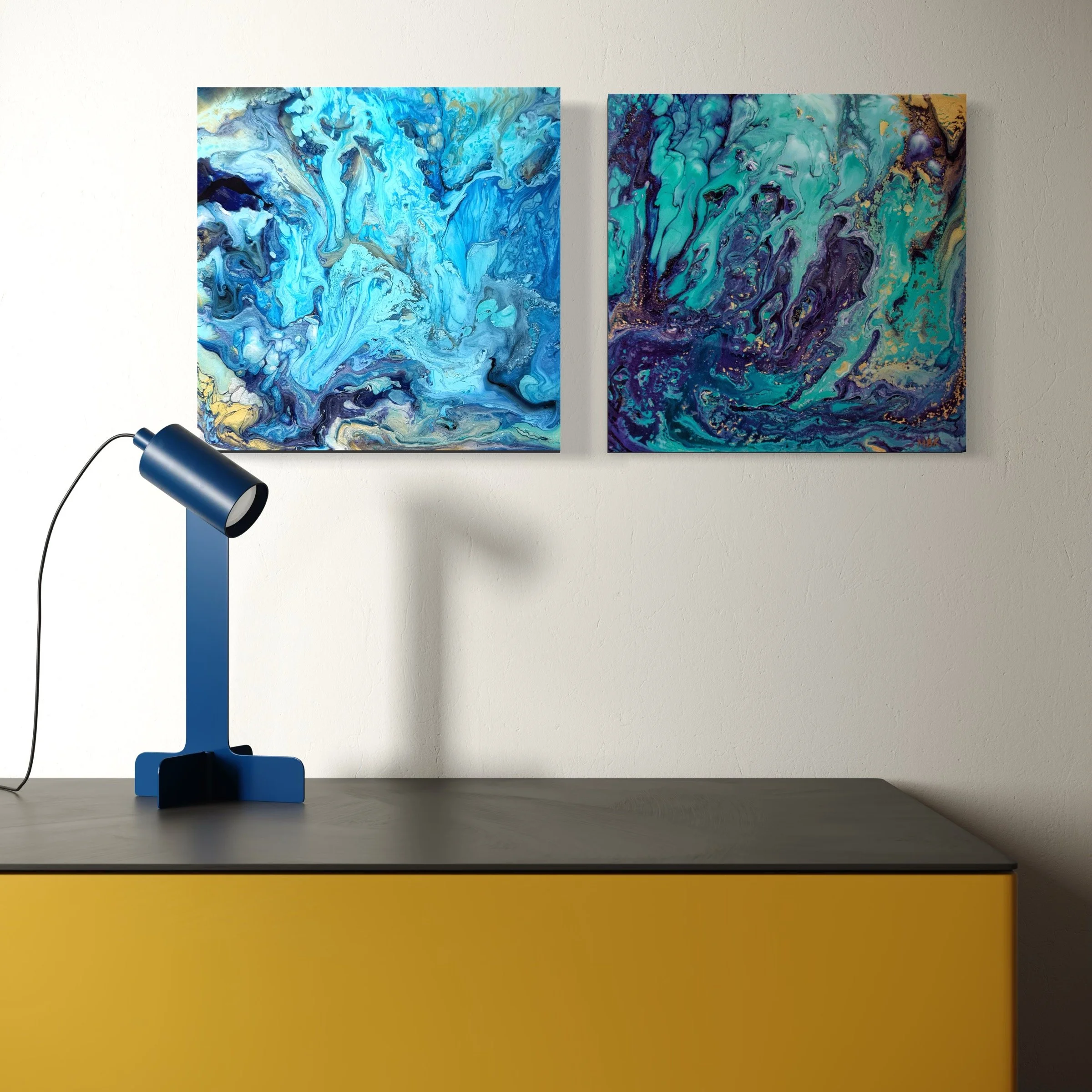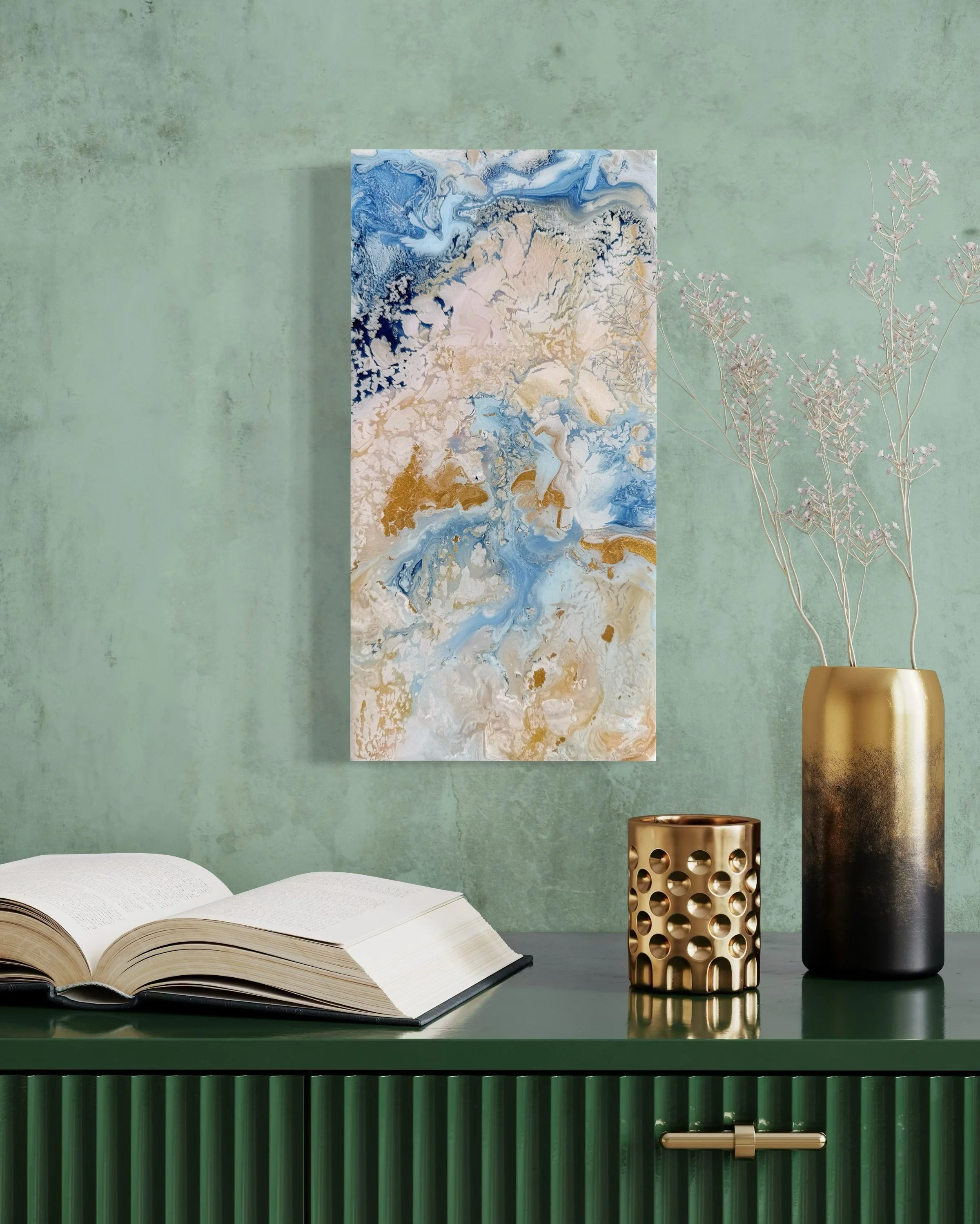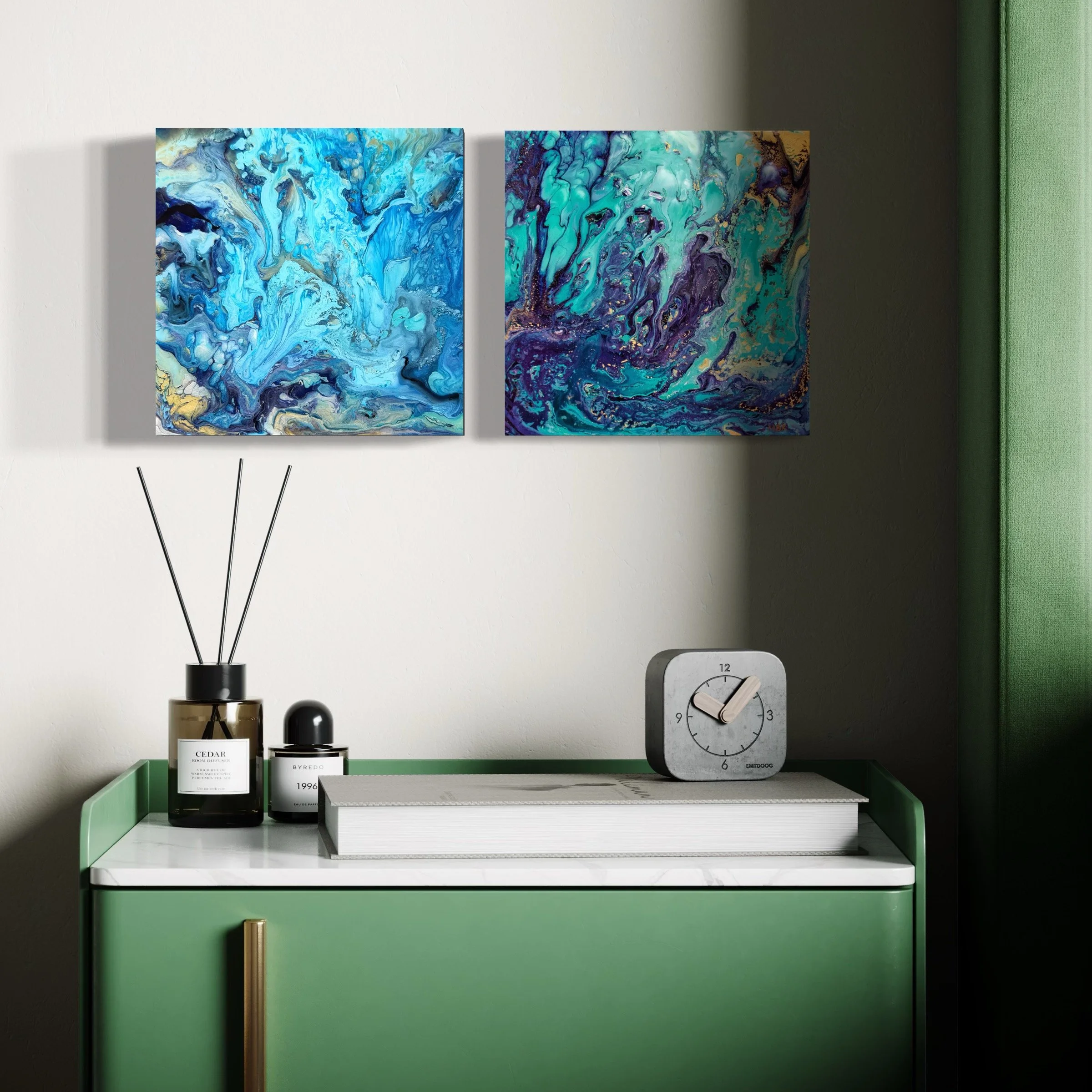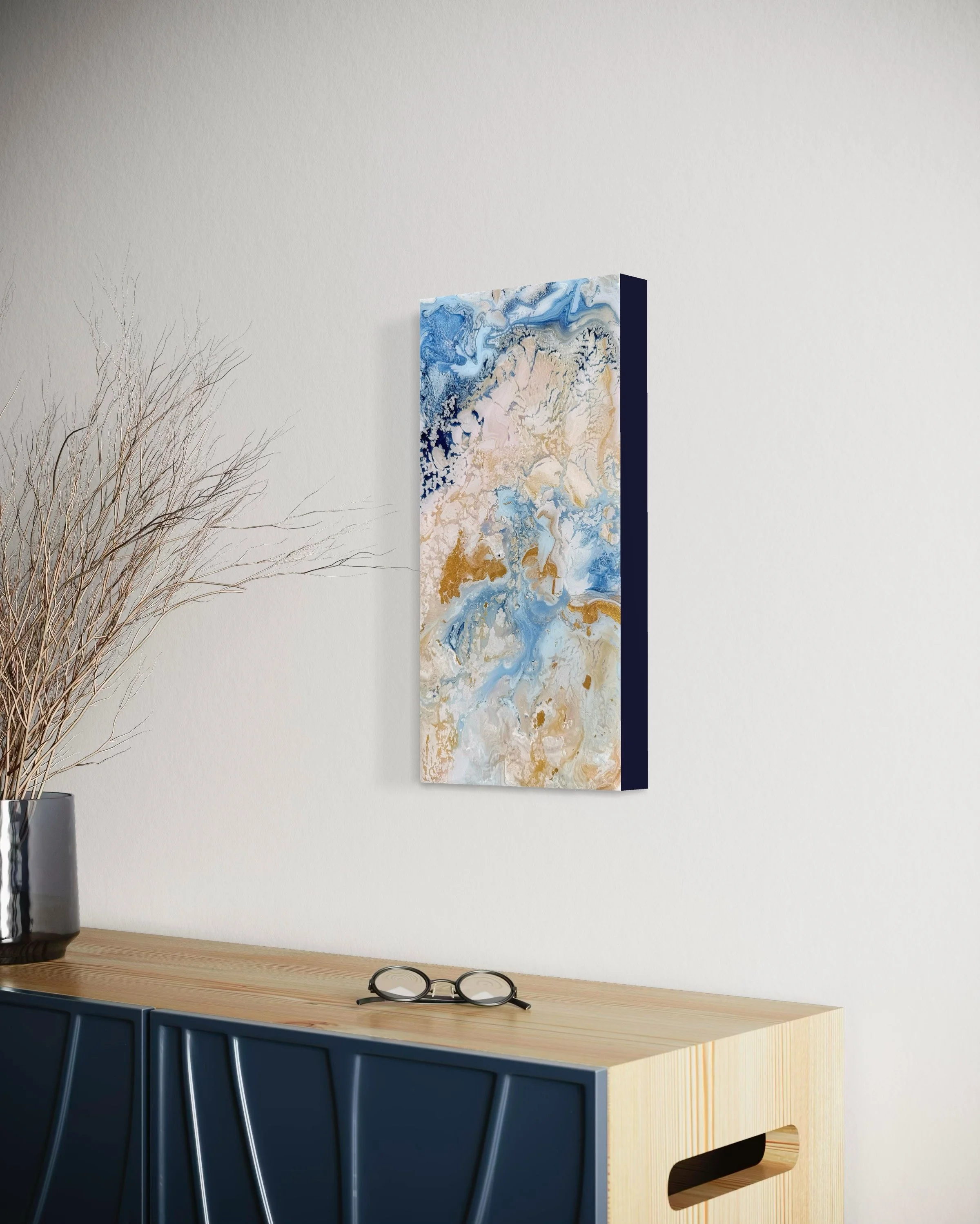 fluid acrylics and cut canvas topped with high gloss epoxy resin on 7/8” cradled wood panel