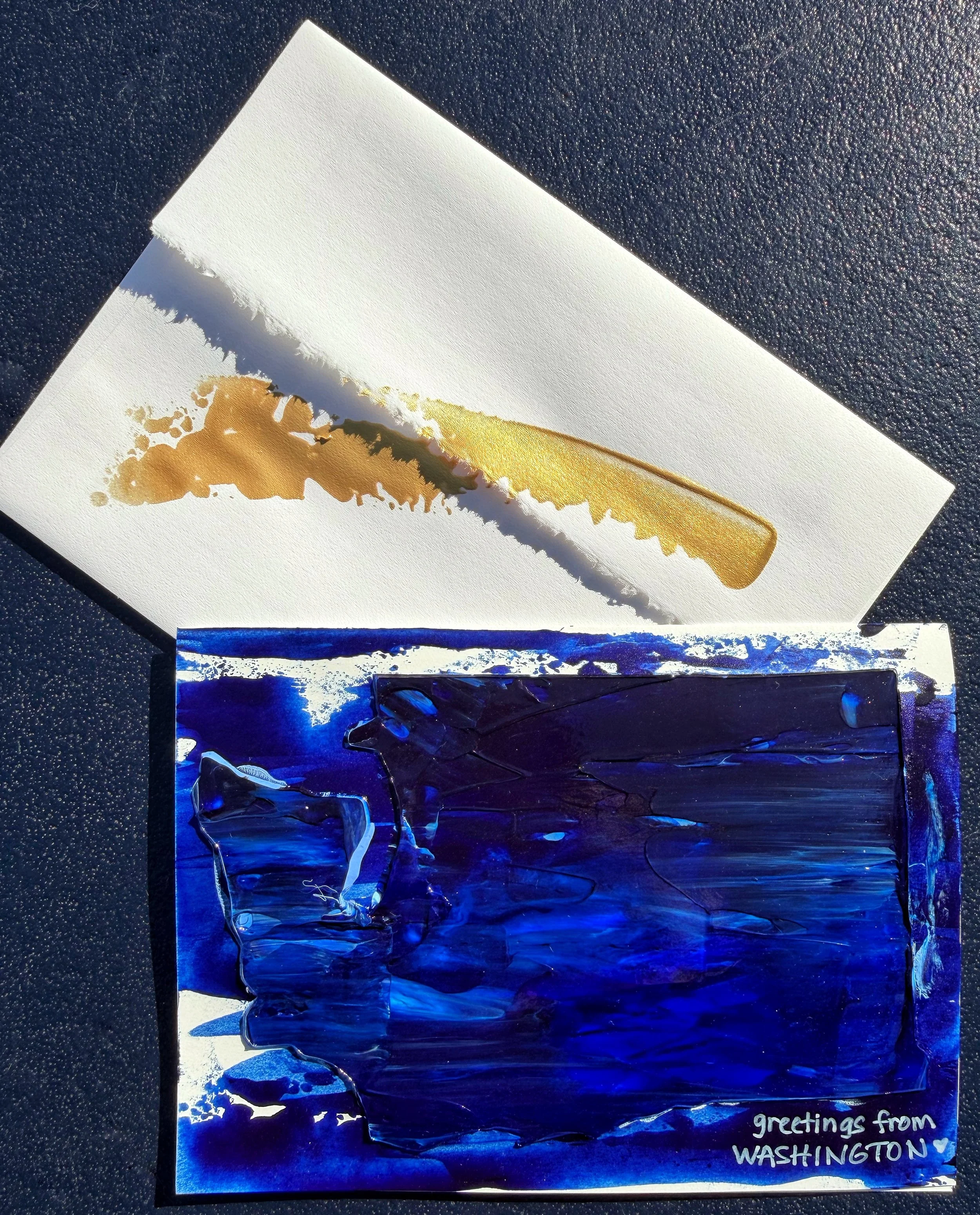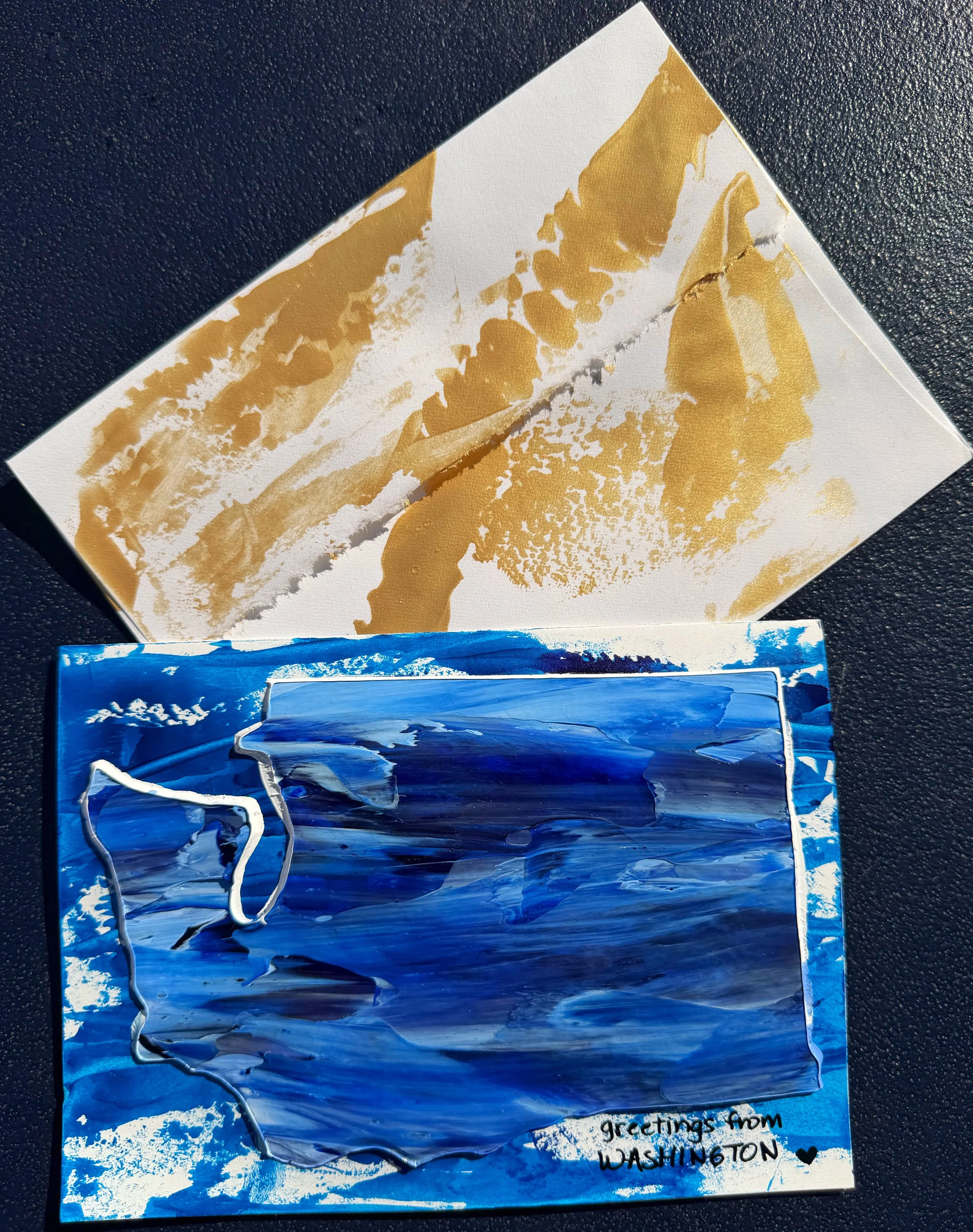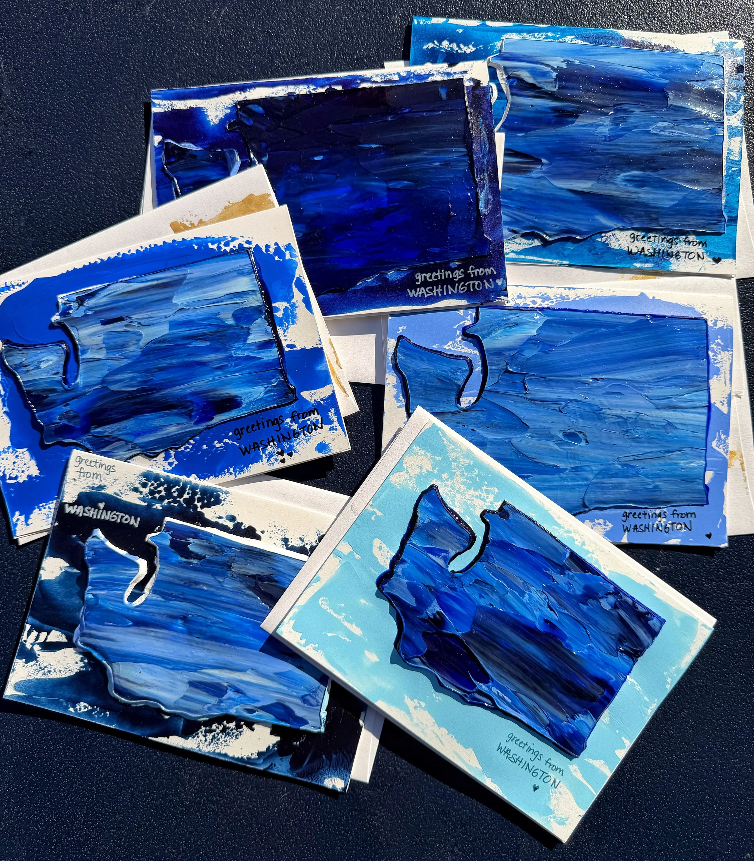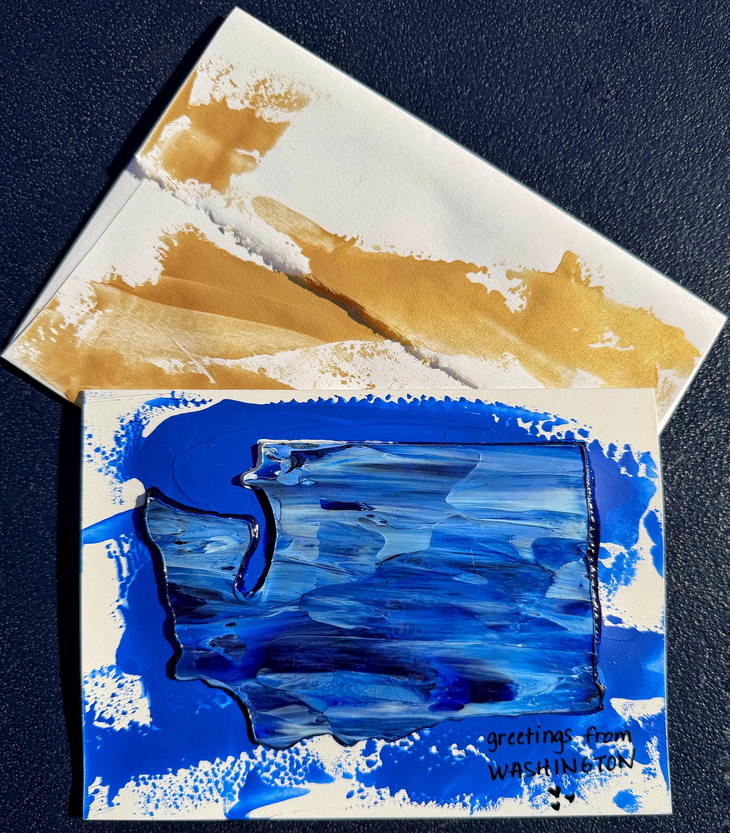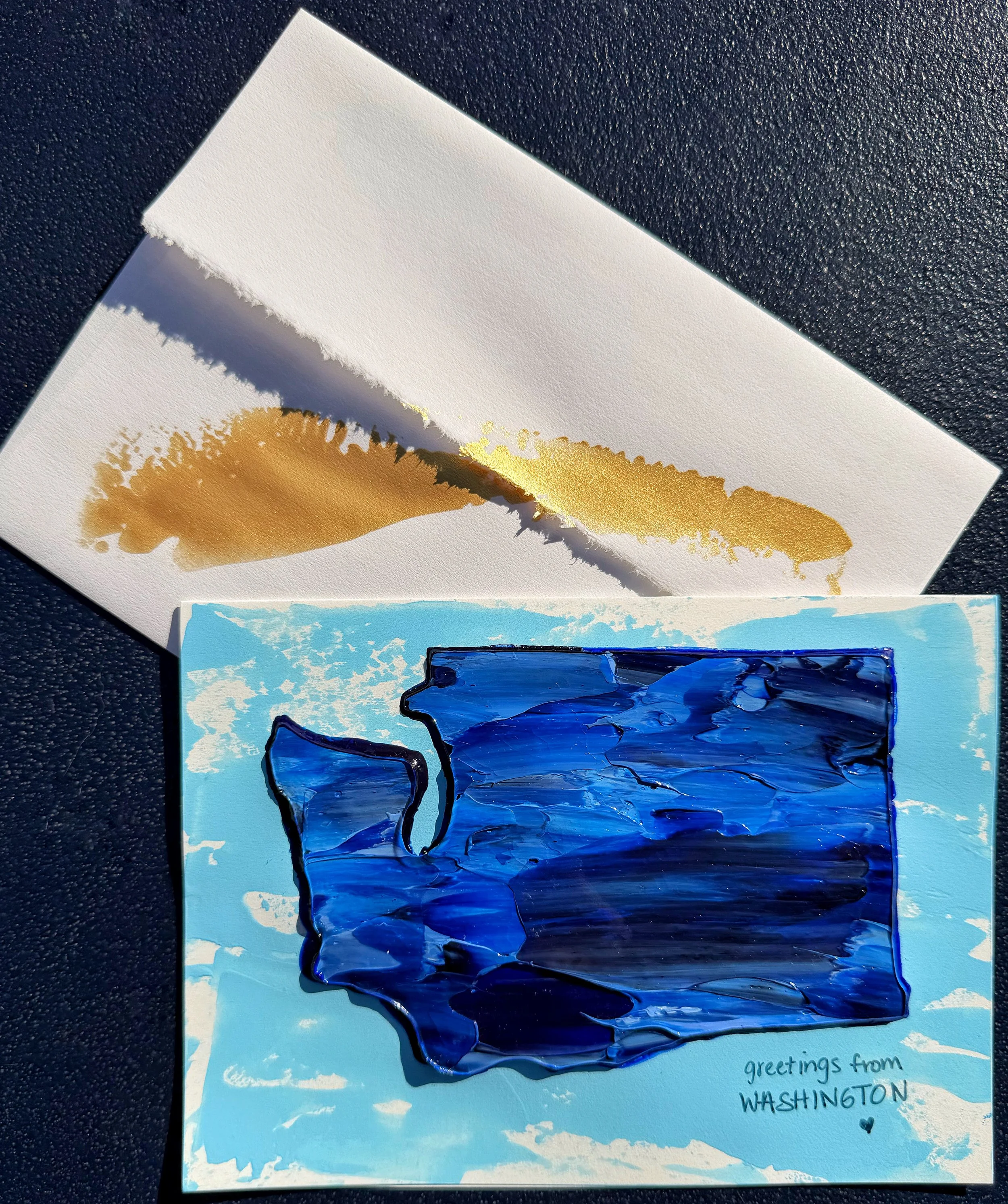 hand-painted greeting card featuring textured acrylic washington state and hand-written “greetings from washington” message. blank inside.