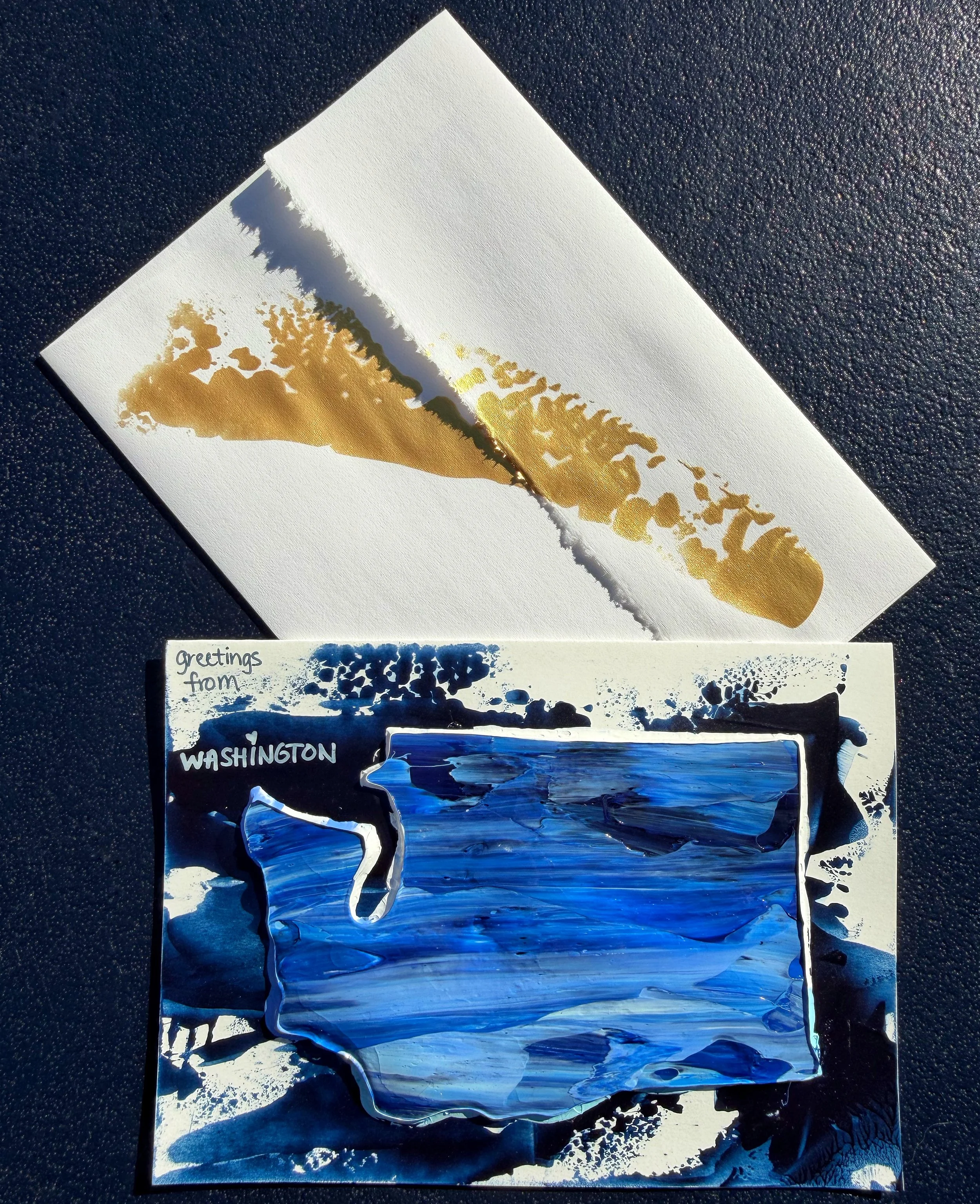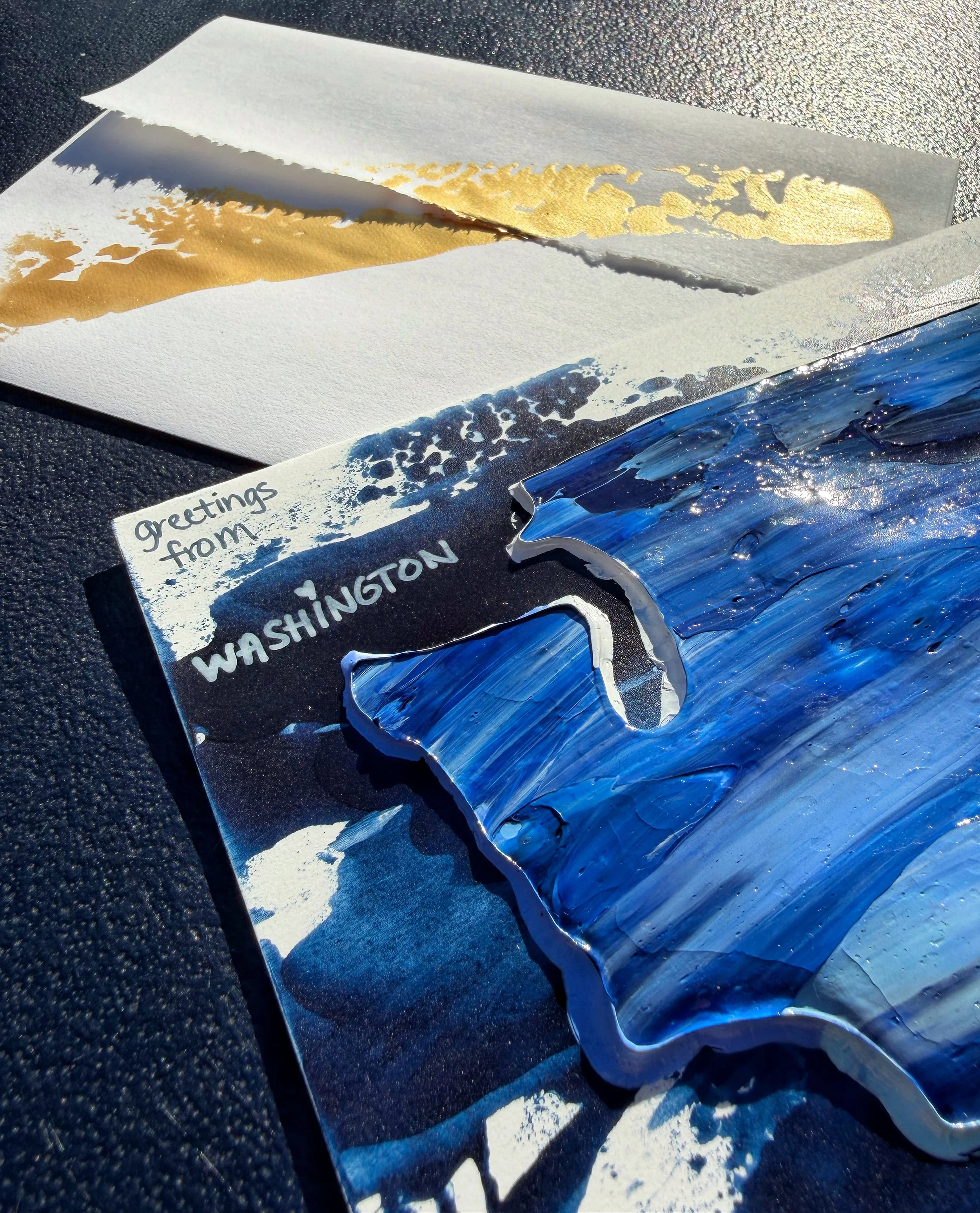 hand-painted greeting card featuring textured acrylic washington state and hand-written “greetings from washington” message. blank inside.